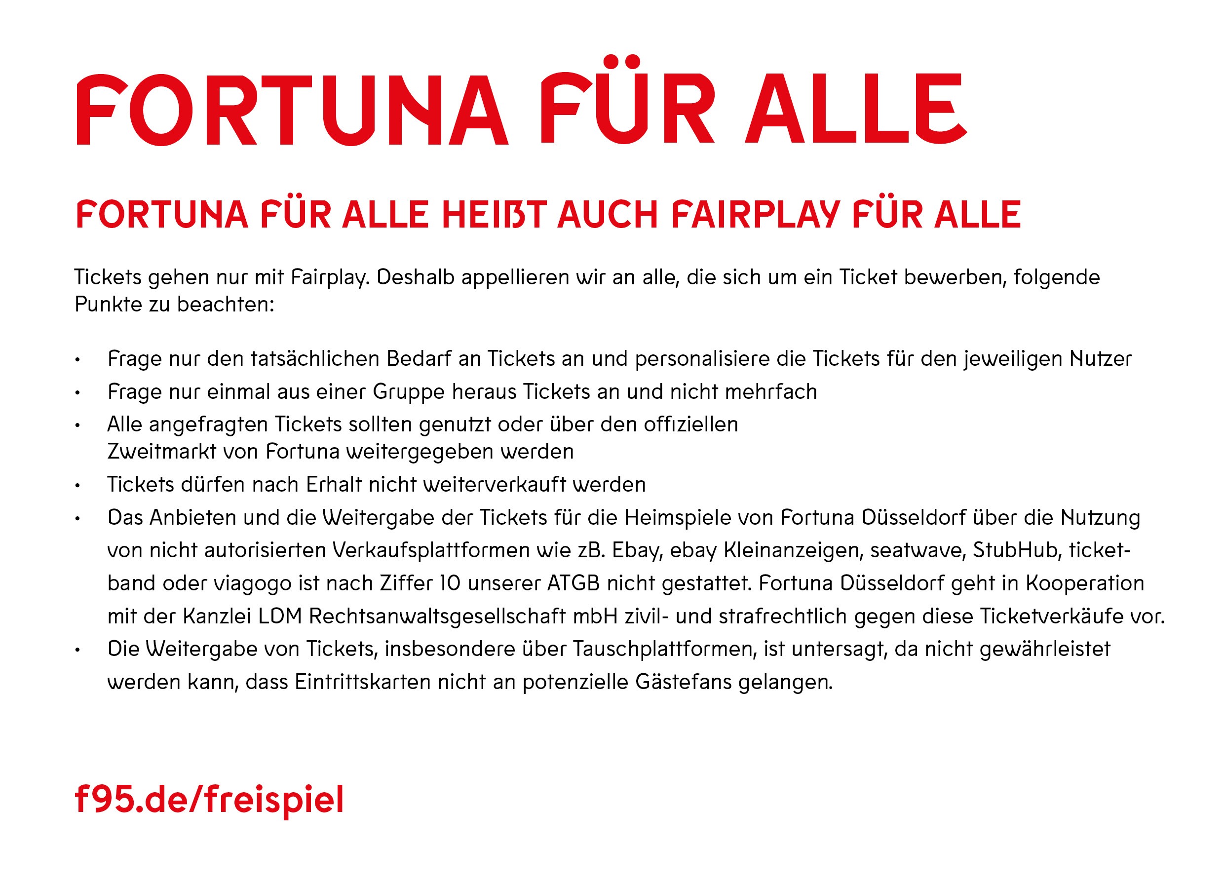 - Wenn Du ein Ticket erhalten hast, aber am Spieltag doch verhindert bist, kannst Du es auf dem offiziellen Fortuna-Zweitmarkt weitergeben. Die Tickets dürfen nach dem Erhalt nicht anderweitig weiterverkauft werden. Bitte denk dran: Freispiel-Tickets gehen nur mit Fairplay!